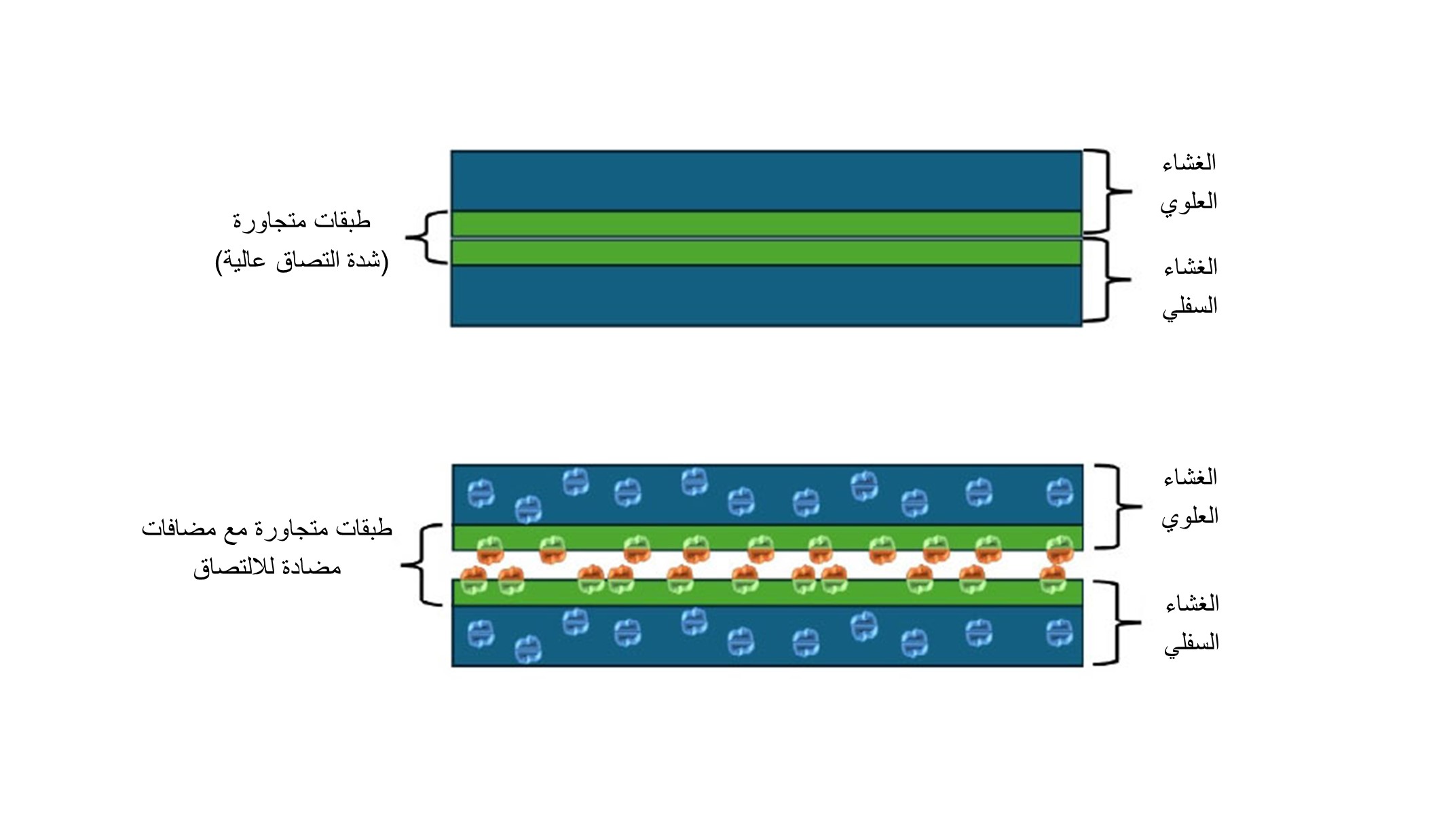 يشير الالتصاق هنا إلى الالتصاق بين طبقات الأغشية المتجاورة، الناتج عن تفاعلات فان دير فال التي تحدث بين المناطق غير المتبلورة في البوليمر. وتُشكِّل العوامل المضادة للالتصاق نتوءات مجهرية على أسطح الأغشية لتكوين مساحة بين الطبقات المتجاورة؛ فيقلل ذلك من معامل الاحتكاك ويُسهِّل عملية فصل الطبقات.