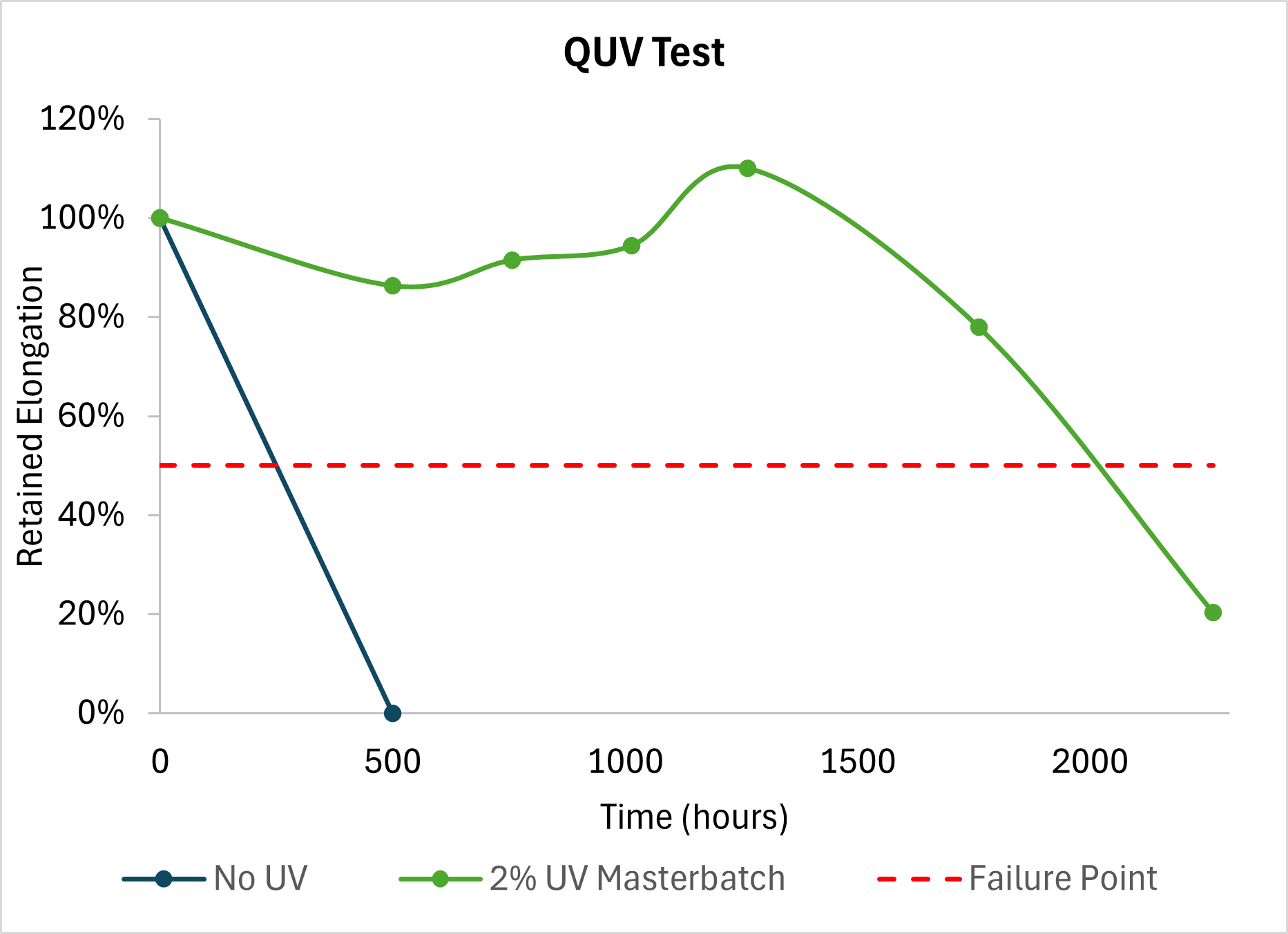 QUV testing is a method of accelerated weathering testing. It is used to determine the performance of UV masterbatches through evaluation of the film’s retained properties after subjection to UV rays. The test is completed in cycles of UV exposure and condensation, simulating a typical day to predict real world exposure. The UV rays cause damage to the polymer which alters its performance. Films containing 2% of Ingenia UV Masterbatch show excellent retention of mechanical properties versus baseline films of the same thickness that do not contain UV masterbatch.