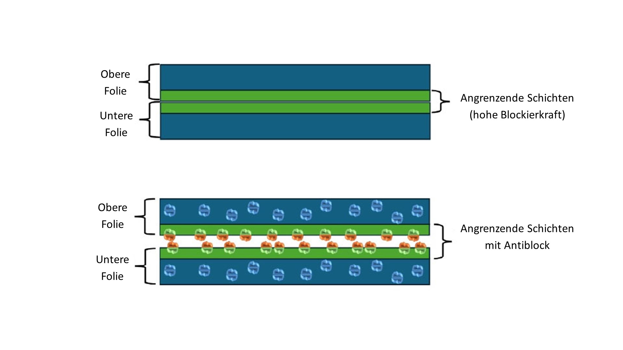 Als Blocking bezeichnet man die Anhaftung zwischen angrenzenden Schichten einer Folie, die durch Van-der-Waals-Kräfte zwischen amorphen Bereichen im Polymer verursacht wird. Antiblockmittel bilden mikroskopische Unebenheiten auf der Oberfläche der Folie, um einen Raum zwischen angrenzenden Schichten zu schaffen, durch den der Reibungskoeffizient reduziert und die Trennung der Schichten erleichtert wird.