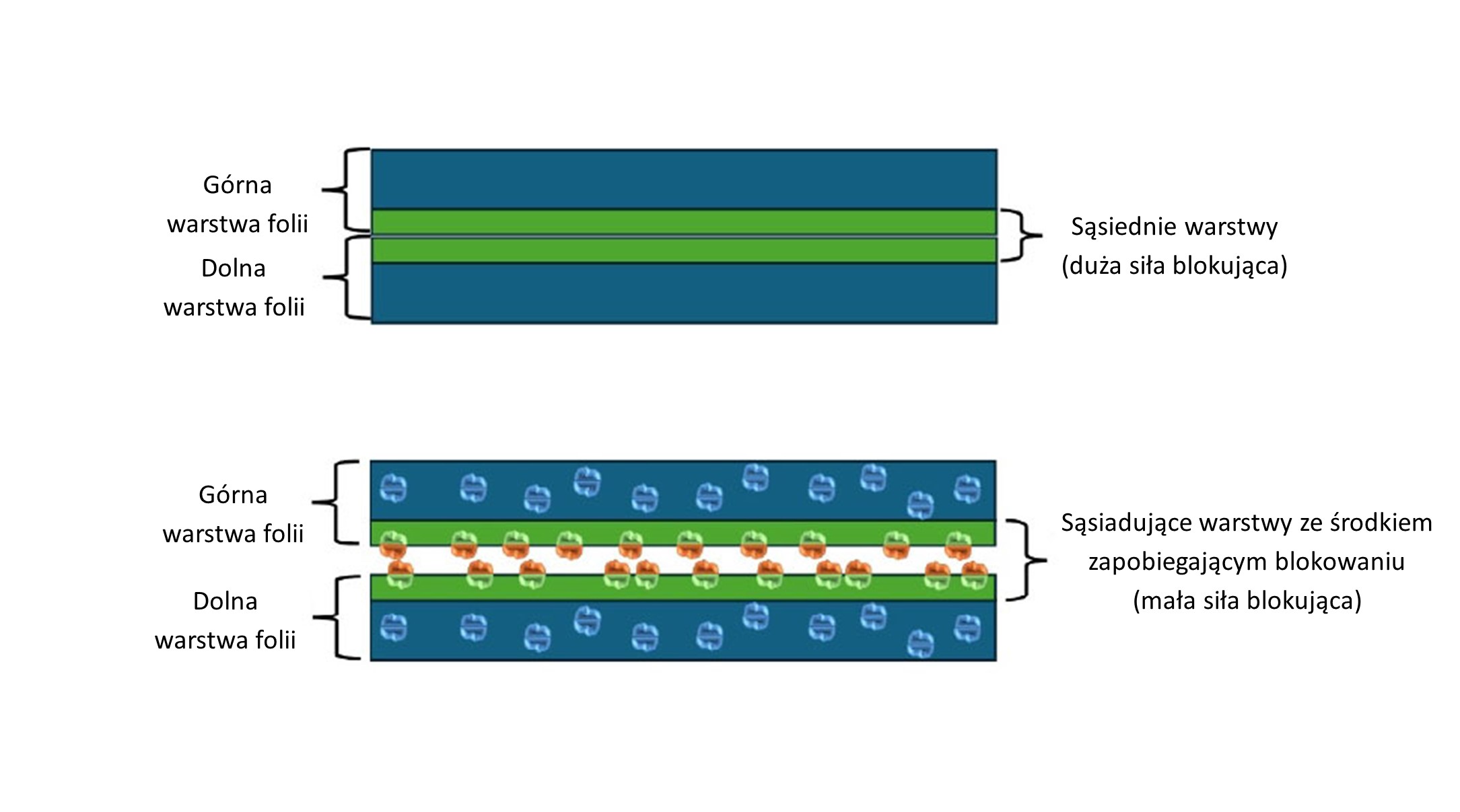 Blokowanie opisuje przyczepność między sąsiednimi warstwami folii spowodowaną oddziaływaniami Van der Waalsa między obszarami amorficznymi w polimerze. Środki zapobiegające blokowaniu umożliwiają formowanie mikroskopijnych wypustek na powierzchni folii, tworząc w ten sposób przestrzeń między sąsiednimi warstwami, co zmniejsza współczynnik tarcia i ułatwia rozdzielanie warstw.